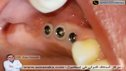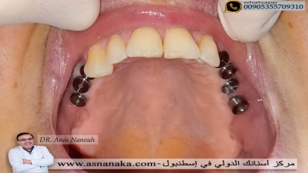 صورة لزرعات الأسنان في فم المراجعة لاحظ لون اللثة الوردي الصحي حول كل زرعة