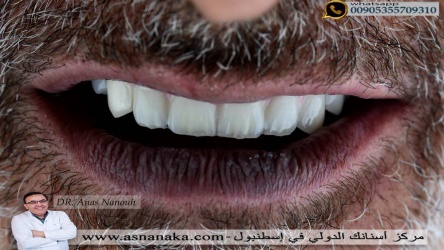 ابتسامة المراجع بعد الأنتهاء من تركيب الاسنان فوق الزراعات والحصول على إبتسامه هوليود المصنوعه من الزيركون مع وجه تجميل من الإماكس والملونات التي تعطي للاسنان الشكل الطبيعي