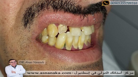 مراجع كويتي يقيم في بريطانيا يعاني من تراجع لثه وإنحسار عظمي كبير في الفك العلوي مما سبب في تحرك الاسنان وفي وجود رائحه فم بسبب الالتهابات وقد تم ازاله الاسنان في الفك العلوي وبعض الاسنان في الفك السفلي وزراعه اسنان في كلا الفكين مع الحفاظ على بعض الاسنان في الفك السفلي تمت زراعه الاسنان بدون شق جراحي خلال ساعه ونصف وبعد اربعه اشهر راجعني من اجل تركيب التركيبات فوق الزرعات وفوق الأسنان الباقيه