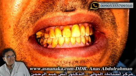اسنان المراجع قبل البدء بالعلاج لاحظ تصبغ الاسنان الشديد نتيجه التسمم الفلوري الناتج عن زياده كميه الفلور في مياه الابار