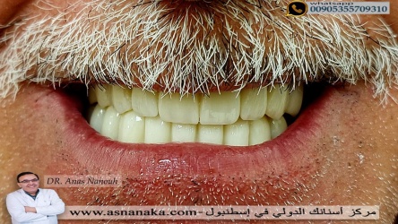 مراجع من فرنسا سوري الاصل راجعني من اجل زراعه أسنان في كلا الفكين وقد رغب بالزرعات الفرنسيه لانها بالاساس موجوده في بلده التي يقيم فيها وبسبب جوده المنتج ايضا واسعاره المعتدله وبالفعل تم زراعه 12 زرعه في كلا الفكين وبعد اربعه اشهر تم تركيب تركيبات الزيركون ذات الوجوه التجميليه من الايماكس والملونات الطبيعيه التي تعطي للتركيبات الشكل الطبيعي والمتقن كما ستلاحظون في الصور التاليه