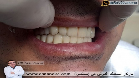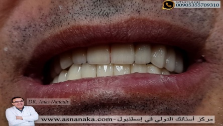 مراجع من المغرب العربي يقيم في كندا راجعني من اجل زراعه الفك العلوي وبعض الاسنان في الفك السفلي وقد اختار زرعه بيجو bego الالمانيه وهي زرع عالميه مع كفاله دوليه واسعارها مقبوله فقد تم زراعه الفك العلوي كامله بدون شق جراحي وبدون اي الم مع بعض الزرعات في الفك السفلي وبعد اربعه اشهر راجعني من اجل تركيب التركيبات فوق الزراعات وفوق الأسنان المتبقيه وحصل على إبتسامه هوليود مصنوعه من الزيركون مع وجه تجميل من الإماكس وملونات تعطي للاسنان الشكل الطبيعي جدا