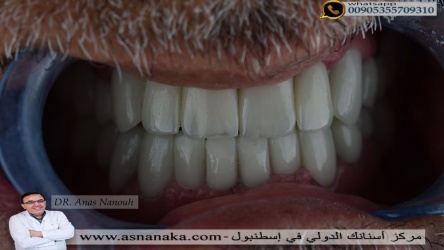 أبتسامة المراجع المصنوعة من الزيركون مع طبقة أيماكس بعد تركيب كامل الأسنان فوق الزرعات والأسنان الطبيعية التي حافظنا عليها