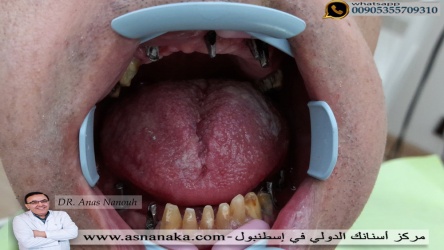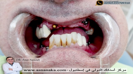 مراجع من فلسطين المحتله يسكن في امريكا راجعني من اجل زراعه بعض الزرعات في الفكين مع الحفاظ على الأسنان الجيده وقد تم ذلك ذلك خلال نصف ساعه بدون شق جراحي وبدون اي الام وبعد اربعه أشهر راجعني من اجل تركيب التركيبات فوق الزراعات وفوق الأسنان الباقيه وحصل على ابتسامه رائعه تدوم مدى الحياه ان شاء الله وفيما يلي مراحل تركيب التركيبات فوق الزراعه