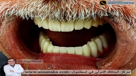 مراجع من فرنسا سوري الاصل راجعني من اجل زراعه أسنان في كلا الفكين وقد رغب بالزرعات الفرنسيه لانها بالاساس موجوده في بلده التي يقيم فيها وبسبب جوده المنتج ايضا واسعاره المعتدله وبالفعل تم زراعه 12 زرعه في كلا الفكين وبعد اربعه اشهر تم تركيب تركيبات الزيركون ذات الوجوه التجميليه من الايماكس والملونات الطبيعيه التي تعطي للتركيبات الشكل الطبيعي والمتقن كما ستلاحظون في الصور التاليه