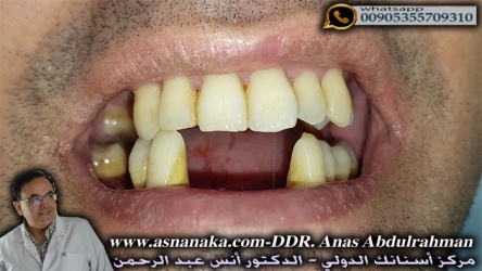 مراجع من المغرب العربي يعيش في فرنسا راجعني بعد ان سمع عن أسعار زراعة الأسنان الاقتصادية عندنا من اجل علاج اسنانه التي بدات بالتساقط الواحدة تلو الاخرى وبعد التصويره بالأشعه البانورامية تبين لنا ان الأسنان تراجع عنها العظم بشكل كبير اما سيؤدي لاحقا اذا لم يتم علاجها الى تساقطها جميعاً لذلك قمنا بقلع بعض الأسنان التي كانت تهتز بشكل كبير وابقينا على معظم الاسنان المهتزة مع تدعيمها من خلال طريقه خاصه بتركيبات الزيركون وزراعه زرعات بعض الاسنان التي تم قلعها وبالنهايه قمنا بتركيب تركيبات الزركون فوق جميع الاسنان بعد اربعه اشهر من زراعه الاسنان