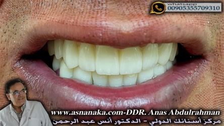 تركيبات الأسنان الزيركونية بعد تثبيها على الدعامات والأسنان في كلا الفكين والمصنوعة من الزيركون و الأيماكس والحد القاطع الكريستالي